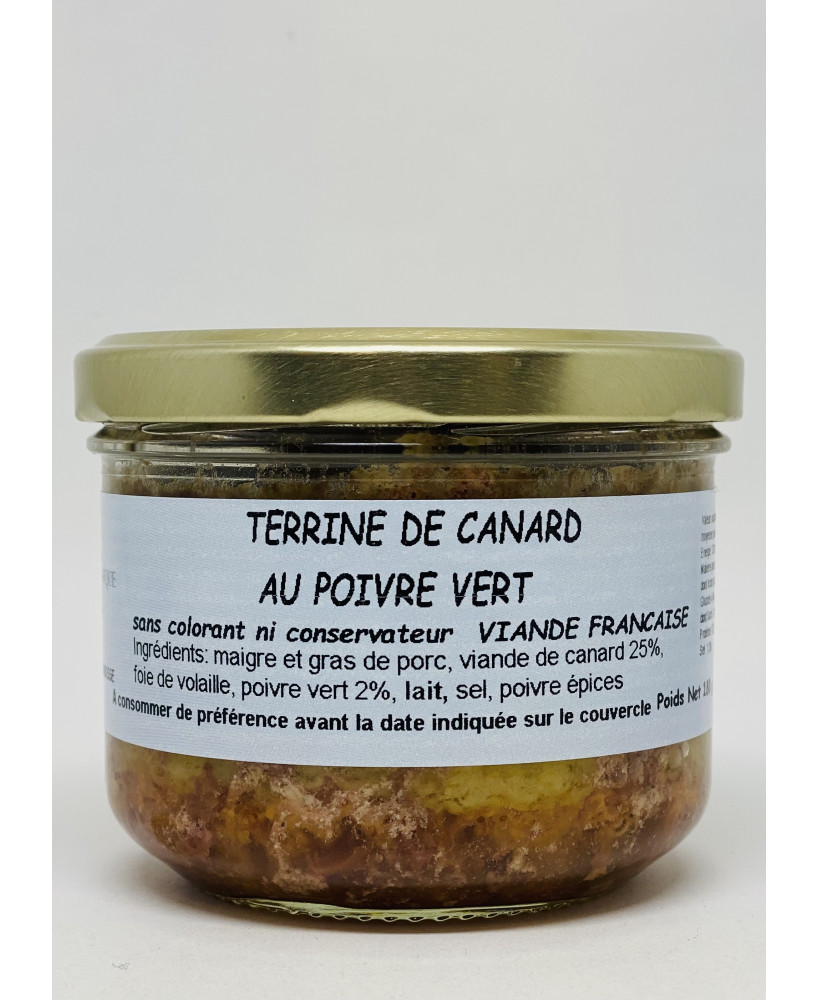 Composition : maigre, gras de porc*, viande de canard (25%), foie de volaille, poivre vert (2%), lait, sel, poivre, épices