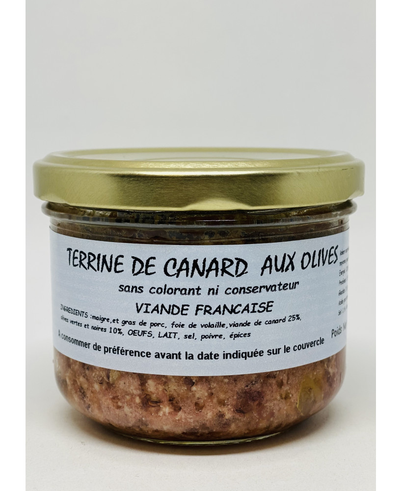 Composition : maigre, gras et fois de porc*, viande de canard (25%), foie de volaile, oeufs, olives vertes et noires (10%), oeuf, lait, sel, poivre, épices