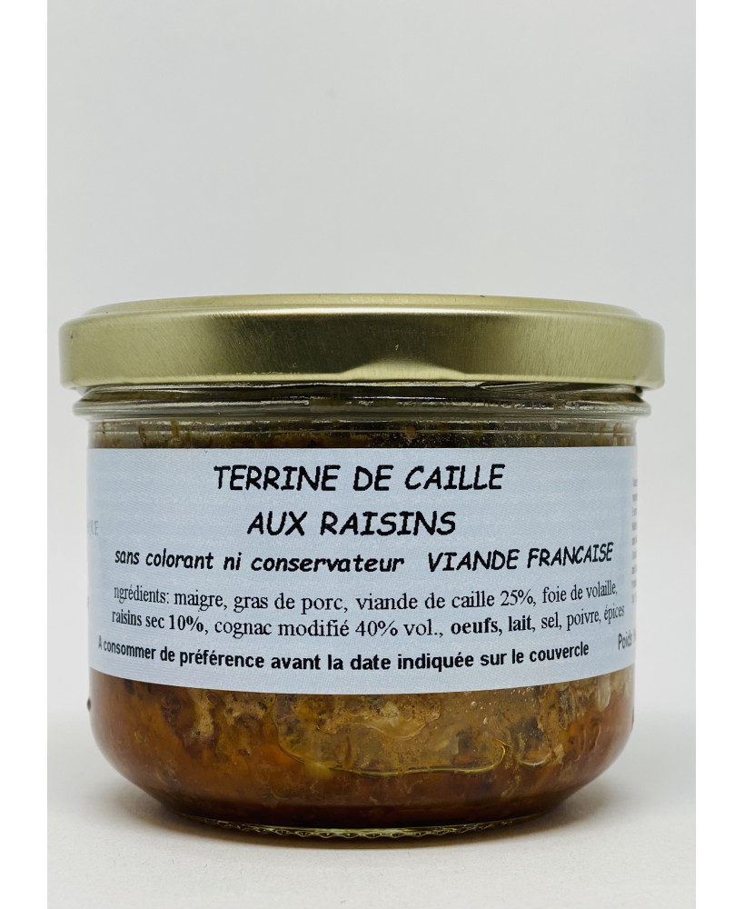 Composition : maigre, gras de porc*, viande de caille (25%), foie de volaille, raisins sec (10%), cognac modifié (40%vol.), oeufs, lait, sel, poivre, épices
