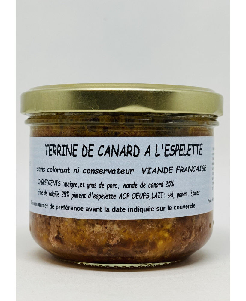 Composition : maigre, gras et fois de porc*, viande de canard (25%), foie de volaille (25%), piment d'espelette AOC, oeufs, lait, sel, poivre, épices