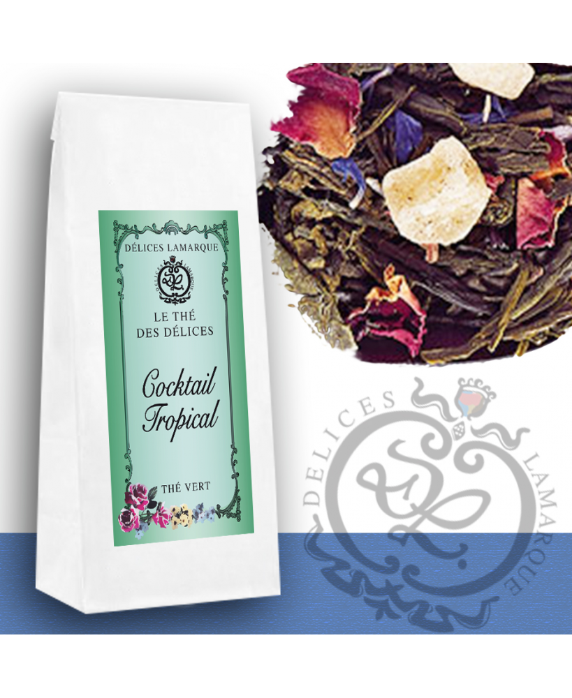 Ingrédients : Thé vert, morceaux d’ananas, pétales de bleuet, pétales de rose, arômes.