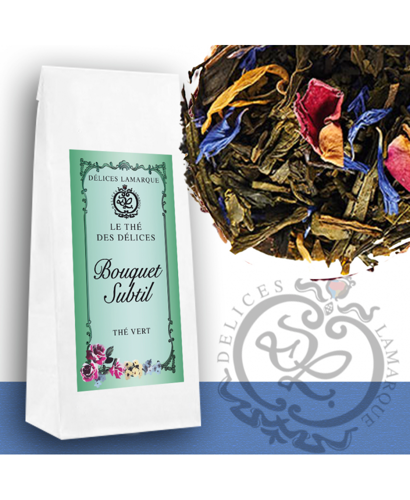 Ingrédients : Thé vert, fleurs de bleuet, pétales de rose, fleurs de souci, arômes.
