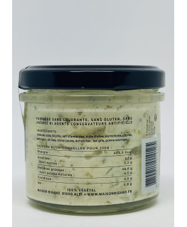 Composition : Huile de colza (43,6%), lait d'amandes, huile d'olive, cornichons, câpres, estragon, ail rose, citron jaune, échalotes, sel gris, poivre sauvage.